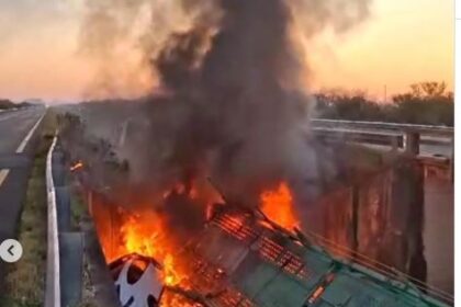 UN CAMIÓN CON AUTOS VOLCÓ Y SE PRENDIÓ FUEGO
