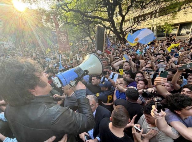 El hombre camina, o intenta, con una sonrisa dibujada que se le va a borrar por el agite. Despeinado prolijo y una patilla prominente. Los custodios apenas pueden sostener la presión de la gente y aunque la temperatura sube por la muchedumbre, Javier Milei está de campera de cuero. Bajo esa campera tiene otras ropas que parecen desentonar en medio de una tarde primaveral en Mendoza. Hay algunos cientos de personas que se retuercen en medio del pogo para poder llegar. Una señora se cae por la presión; a uno de los costados hay opositores que lo insultan tibiamente y vuela alguna “papa” que no encuentra el destino buscado.