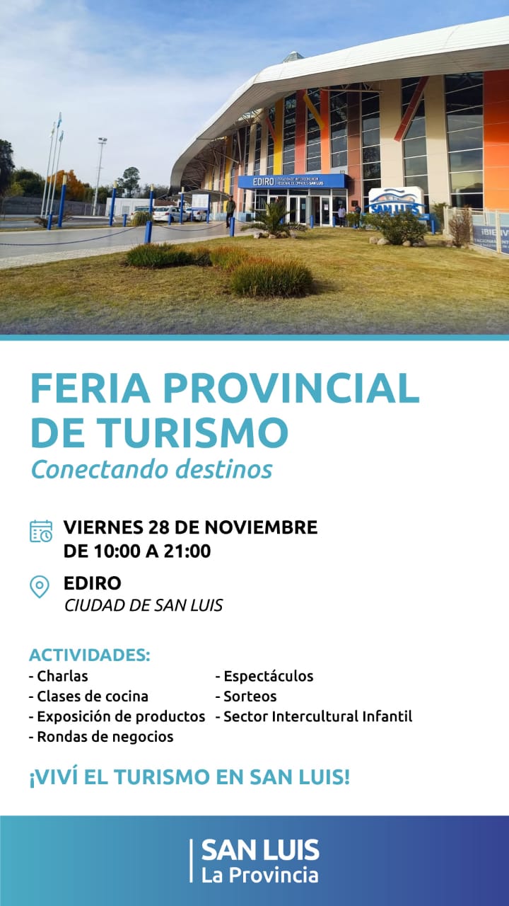 Este viernes 28 de noviembre, de 10:00 a 21:00, la Estación de Interconexión Regional de Ómnibus (EDIRO) será sede de este evento que impulsa el desarrollo turístico de San Luis. Bajo el lema ‘Conectando destinos’, la jornada ofrecerá actividades para profesionales del sector, emprendedores, instituciones, familias y público general.