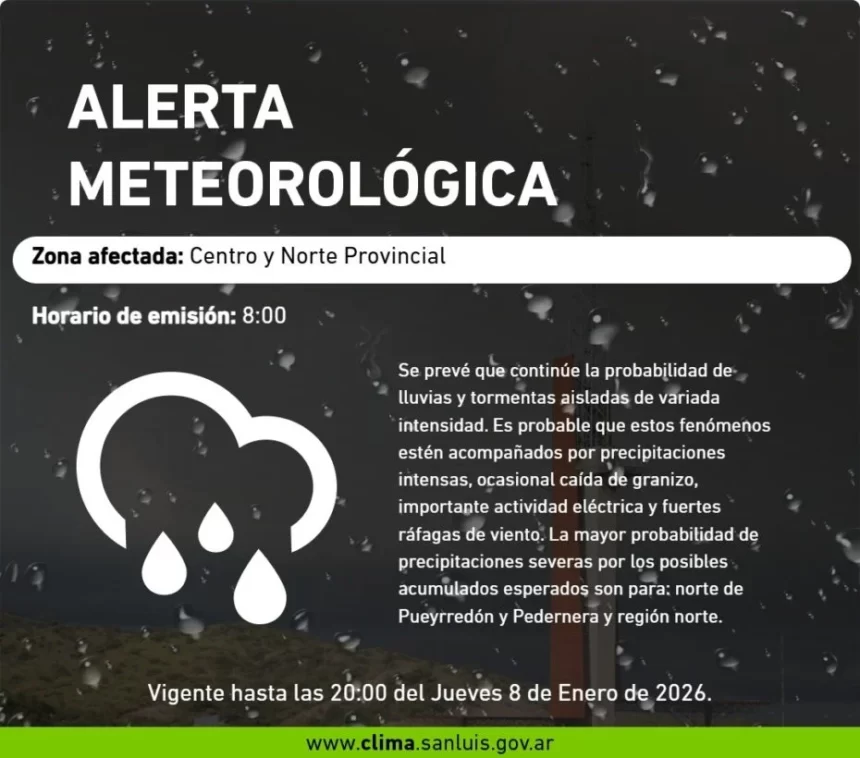 El Servicio Meteorológico Nacional (SMN) emitió una alerta naranja por tormenta en varios países del país incluído el centro y norte de la provincia de San Luis. La Red de Estaciones Meteorológicas, el servicio provincial, remarcó además de las precipitaciones una jornada ventosa con marcado descenso de la temperatura que seguirá el viernes.