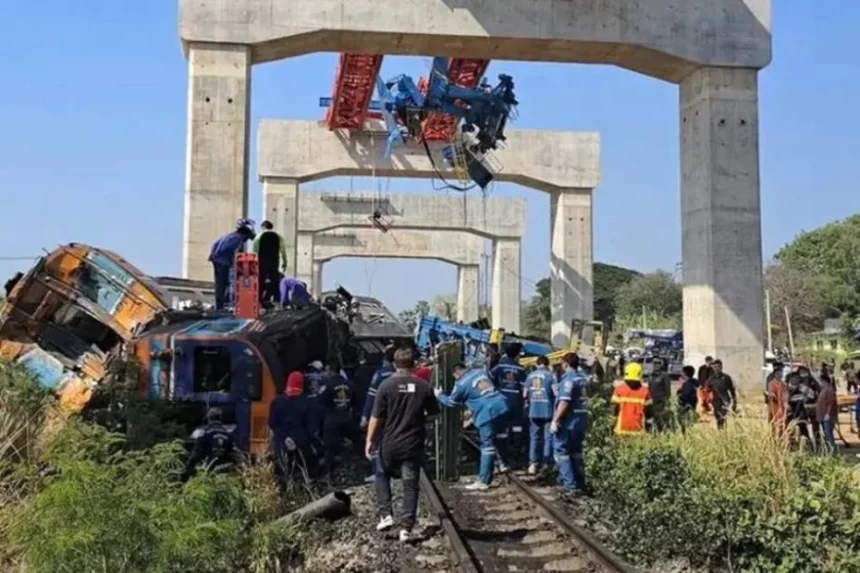Según informes de medios internacionales, el trágico hecho ocurrió en la localidad Ban Thanon Khot, subdistrito de Si Khiew, cuando la grúa cedió sobre un tren que viajaba de Bangkok a la provincia de Ubon Ratchathani.